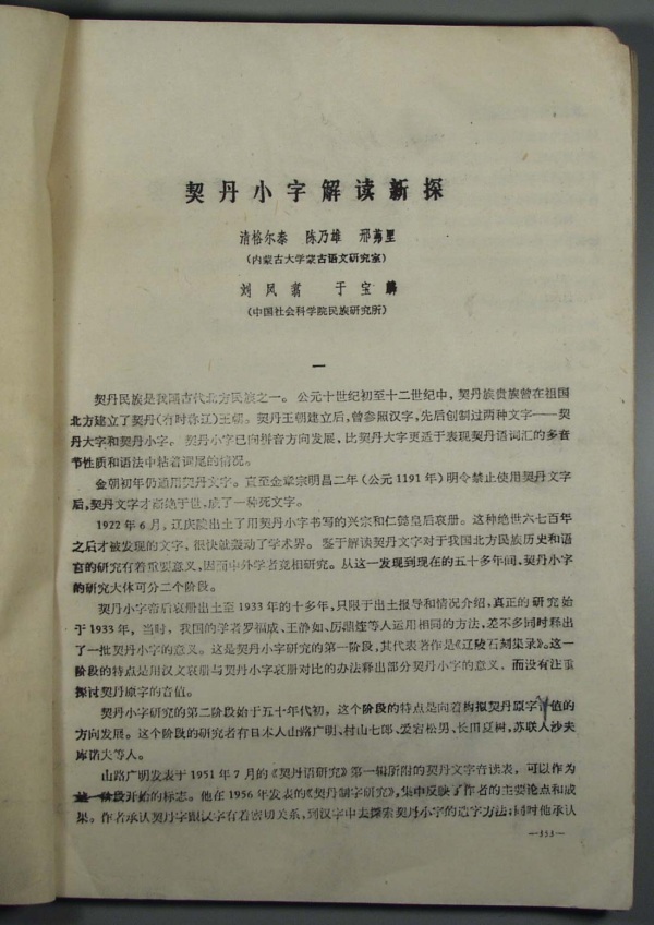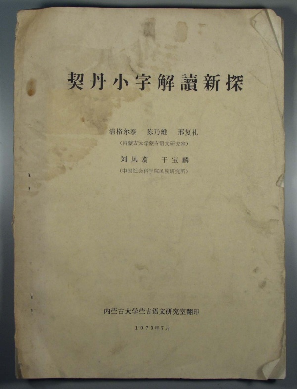 | 管理/所蔵 | 古代文字資料館/吉池孝一蔵 | 『考古学報』1978年第3期に掲載された同論文を、1979年に内蒙古大学蒙古語文研究室 が「翻印」(複製、翻刻)したもの。表紙を付けてホチキス止めした簡便な体裁。 抜き刷り風ではあるが翻刻年を明記の上で発行しているので独立した一本とみなさざるを得ない。 同論文および「關於契丹小字研究」『内蒙古大学学報』1977年第4期は、後に、期を画する 名著『契丹小字研究』(中国社会科学出版社,1985)に結実する。 |
