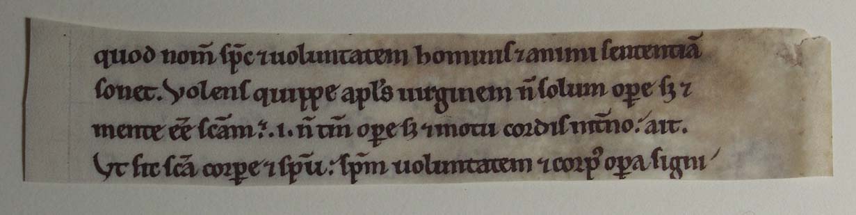 | 管理/所蔵 | 古代文字資料館/個人蔵 | フランス、ブルゴーニュ、シトー修道院、1150年頃。 ヴェラムにシトー修道会のロマネスク体文字で書かれたラテン語文書。 1098年のシトー修道会設立からわずか半世紀後に書かれたもの。 リヨンのフロルスによる『シトー修道会の本山であるブルゴーニュのシトー修道会におけるパウロの書簡の解説』という中世教父写本の一部である。 この修道会には1112年に修練士として入門したクレアボーの聖ベルナールがいた。 シトー修道会の写本は、羊皮紙の品質、注意深く書かれた文字、各ページのレイアウトなど、絵画的美しさが高く評価されている。 12世紀中葉のシトー修道会装飾写本は現在では非常に貴重になっている。(解説は『文字遺産集成』による) |