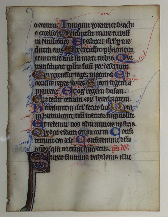 イギリス、14世紀。ラテン語でヴェラムに書かれた詩篇集の一葉。 黒インクによる角ばったゴシック体の文字が17行にわたって書かれている。 ピンクのテンペラ地に磨かれた金箔による2行大の頭文字入り。 (解説は『文字遺産集成』による)