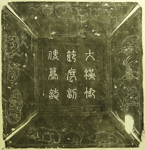 遼・耶律習涅の墓誌。誌蓋表(漢文題)、誌蓋裏(契丹大字文墓誌銘)、誌石(漢文墓誌銘)のうち、誌蓋表(漢文題)拓本。 1行目:大横帳 2行目:節度副 3行目:使墓誌 「大横帳節度副使墓誌」とある。 誌石(漢文墓誌銘)に、天慶四年三月(1114年)に嘉鹿山墳墓に埋葬したとあるから天祚帝時代の碑。 劉鳳[者+羽](2009)によると原石は赤峰市巴林左旗の遼上京博物館に所蔵されているという。 参考文献:蓋之庸(2002)『内蒙古遼代石刻文研究』呼和浩特市:内蒙古大学出版社,357-362頁。 劉鳳[者+羽]・唐彩蘭・青格勒(2009)『遼上京地區出土的遼代碑刻彙輯』北京:社会科学文献出版社。 (文責:吉池孝一2013.4.16) |