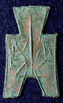 中国戦国時代の貨幣。布銭と呼ばれるタイプのもの。 右「平」、左「陽」。あわせて「平陽」と読む。
