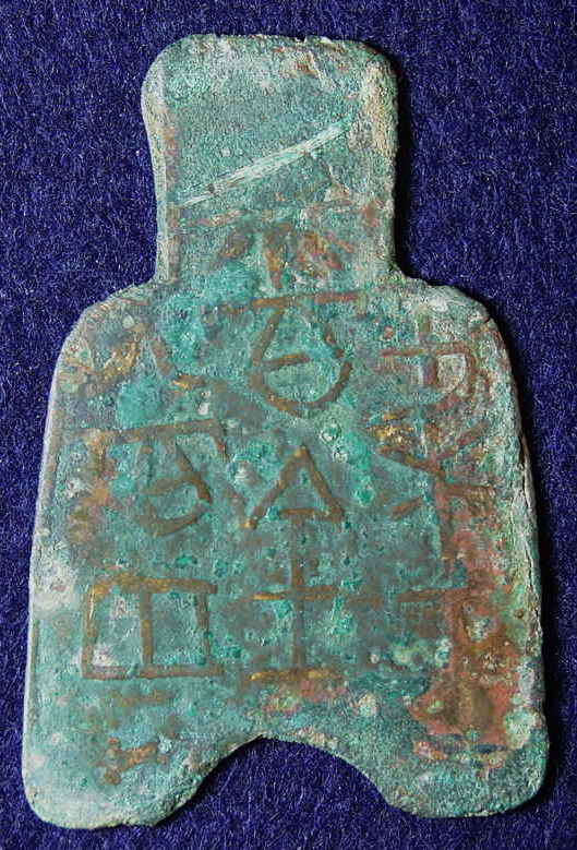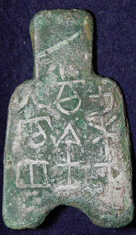 中国戦国時代の魏国の貨幣。布銭と呼ばれるタイプのもの。 右に「梁正」、中に「尚百」、左に「當埒(土偏ナシ)」、あわせて「梁正尚百當埒(土偏ナシ)」と読む。