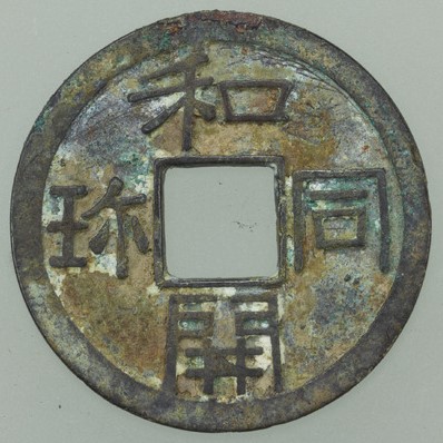 話は少しずれるが、唐の武徳4年(621)に発行された「開元通寶」は当初「開通元寶」と読まれていたらしい。つまり、上部からの時計回りである。後に作られた「順天元寶」(759)や「大暦元寶」(769)が「〜元寶」となっているのはそのためである。しかし、元号として「開元(713-741)」が採用された後は、次第に「開元通寶」の読みが広まり、「建中通寳」(780)のように「〜通寶」を用いるものが現れる。「和同開珎」が上・右・下・左の順になっているのも、「開元通寶」ではなく「開通元寶」に倣ったものと考えると合点がいく。なお、和同開珎の「開」の字形は、中が「井」になっているが、これも唐の「開通元寶(開元通寶)」と同じである。